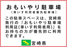 宮崎県が2012年2月1日より導入を開始した「おもいやり駐車場制度」の趣旨に賛同し、現在、宮崎県内32ヶ店に設置しています。