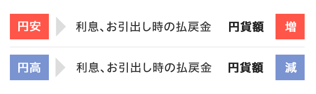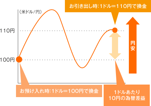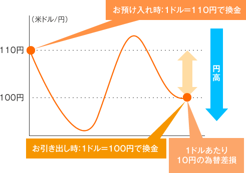 円貨でお受取の場合、お預け入れ時とお引き出し時の為替相場の変化により為替差益・差損が生じる点です。為替差損が生じた場合は、お引き出し時の受取円貨額がお預け入れ時の円貨額を下回る(元本割れする)可能性があります。