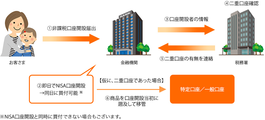 ある年において、NISA口座で新たな投資ができるのは、一人につき1つの金融機関に限られています。例えば、A銀行でNISA口座を開設された場合には、所定の手続きを行わない限り、他の銀行や証券会社、郵便局などでNISA口座を開設することはできません。重複してお申込がないようご注意ください。