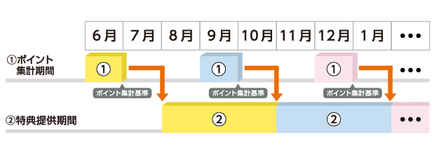 集計月のお取引状況に応じて、ポイントを集計します。集計ポイント数による特典の提供時期は、ポイント集計月の翌々月1日からとなります。