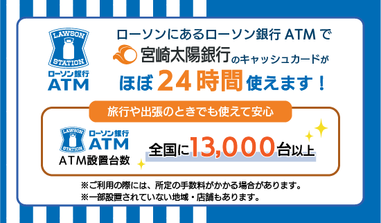 ローソン銀行マークのあるローソンでご利用いただけます。ローソン銀行ATMの設置しているローソンにつきましては、ローソン銀行ホームページをご覧ください。
